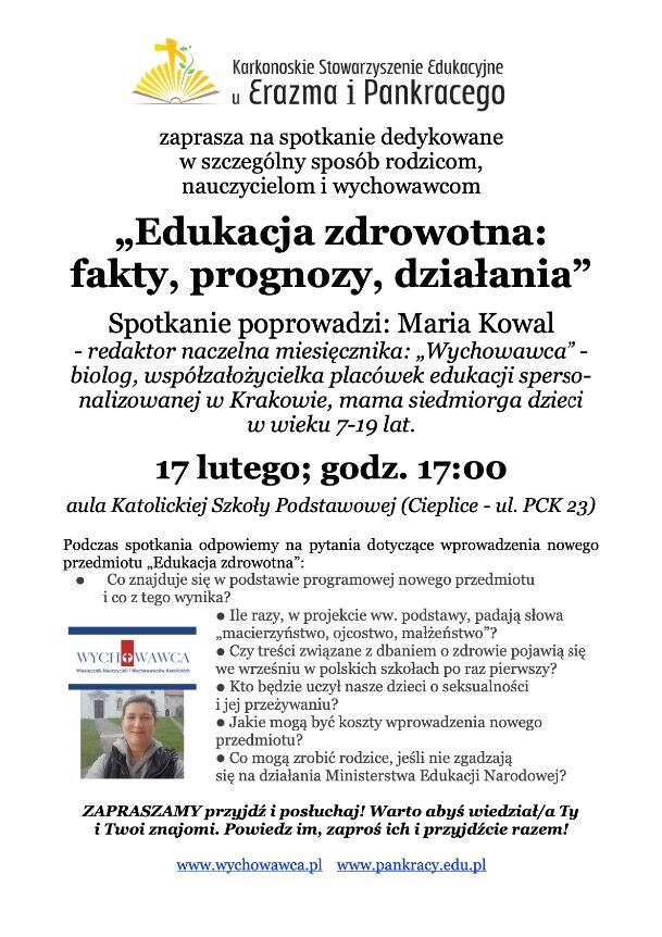 17 lutego; godz. 17:00 aula Katolickiej Szkoły Podstawowej (Cieplice - ul. PCK 23)