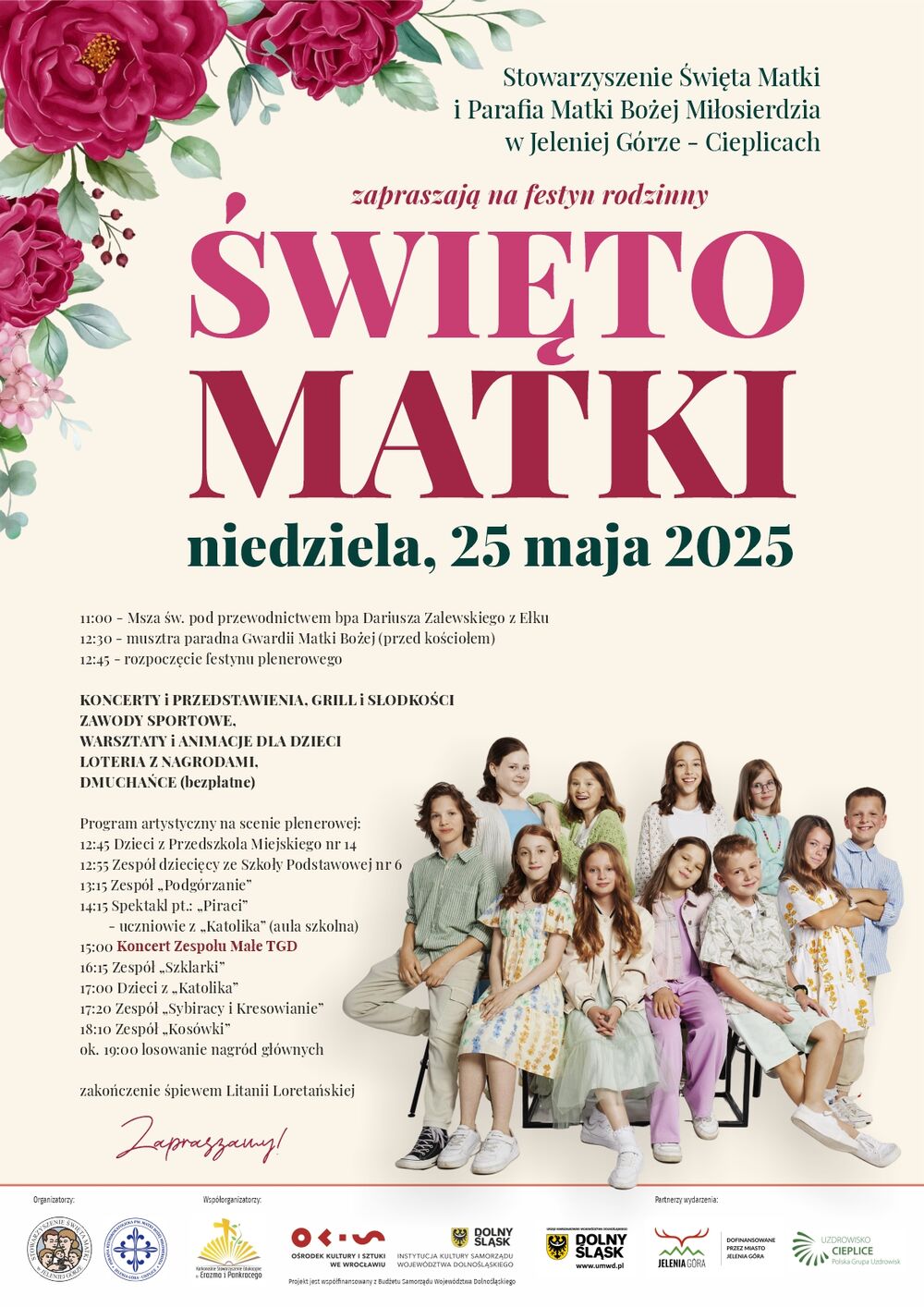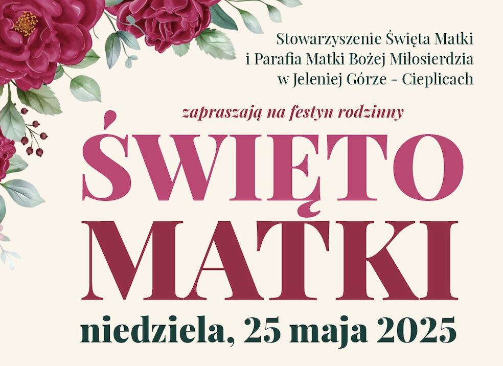 Wraz ze Stowarzyszeniem Święta Matki i Parafia rzymskokatolicka pw. Matki Bożej MIłosierdzia w Jeleniej Górze zapraszamy na: XXXV edycję ŚWIĘTA MATKI w Jeleniej Górze - Cieplicach.