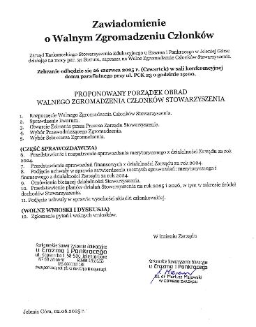 Zarząd Karkonoskiego Stowarzyszenia Edukacyjnego u Erazma i Pankracego w Jeleniej Górze działając na mocy par. 34 Statutu, zaprasza na Walne Zgromadzenie Członków Stowarzyszenia. Zebranie odbędzie się 26 czerwca 2025 r. (czwartek) w sali konferencyjnej domu parafialnego przy ul. PCK 23 o godzinie 19:00.
