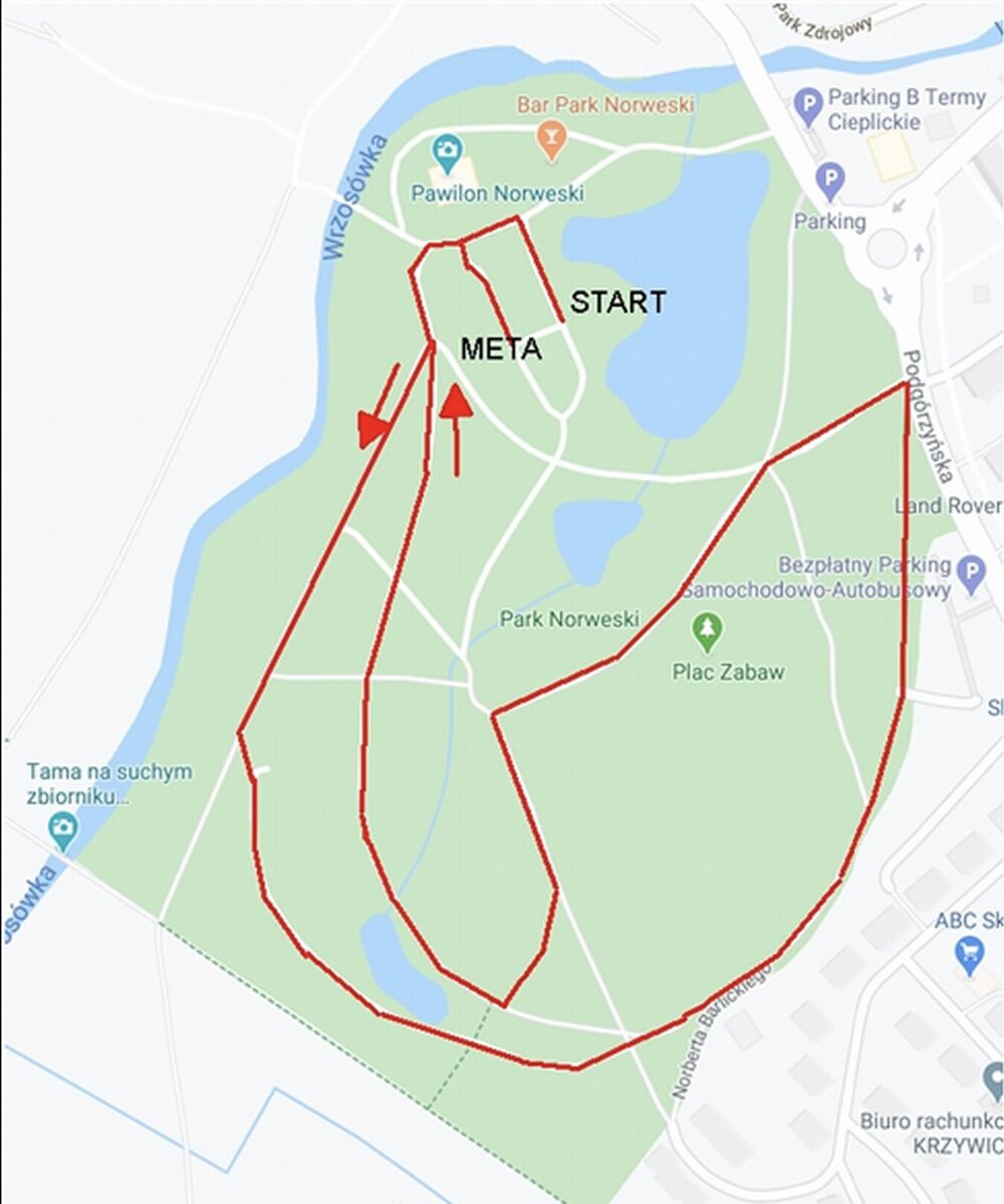 Podobnie jak w latach ubiegłych tak i w tym roku biegniemy w Parku Norweskim w Jeleniej Górze - Cieplicach. Trasa biegu: „Tropem Wilczym. Bieg Pamięci Żołnierzy Wyklętych” Jelenia Góra składa się w przypadku Biegu Rodzinnego - z jednego okrążenia o długości 1963 m oraz w Biegu na 5000 m z niepełnych trzech okrążeń i jest trasą o niskim nachyleniu terenu. Start oraz meta znajdują się w północnej części Parku nieopodal Pawilonu Norweskiego - dawniej budynku Muzeum Przyrodniczego przy podeście widowiskowym. Trasa biegnie głównymi alejkami parku i rozpoczyna się prostą, a potem skręca w lewo wiodąc dalej dookoła parku jego alejkami. Trasa biegu w większości swej długości pokrywa się z najdłuższą trasą ParkRun. Trasa będzie dokładnie oznakowana znakami poziomymi (strzałki i linie ciągłe na podłożu wykonane farbą luminescencyjną) i pionowymi (taśma biało czerwona przymocowana do drzew, latarni i słupów na wysokości wzroku. Start i meta wyodrębnione będą szpalerami tyczek połączonych biało czerwoną taśmą.