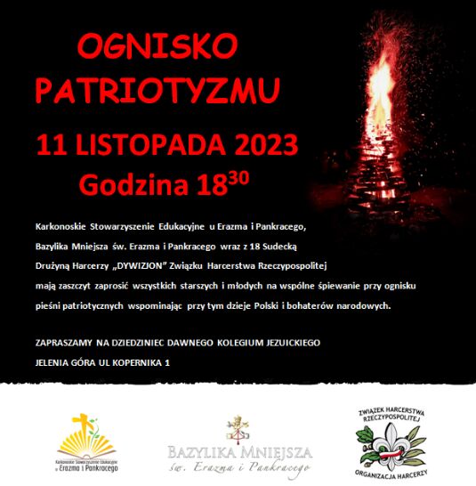 Jak co roku w Jeleniej Górze na dziedzińcu przy Liceum Katolickim, obok Bazyliki (ul. Kopernika 1), będziemy wspólnie śpiewać pieśni patriotycznych przy żywym ogniu. Rozpoczęcie o godz. 18:30.