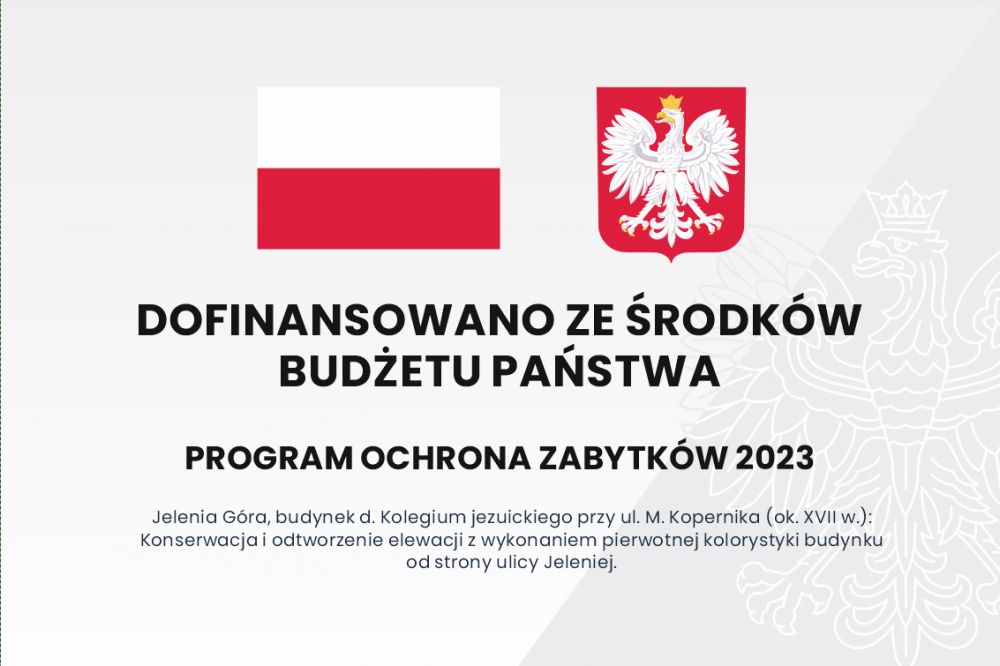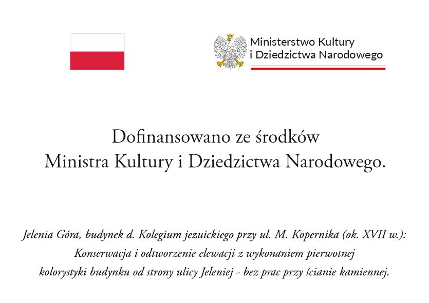 Jelenia Góra, budynek d. kolegium jezuickiego przy ul. M. Kopernika (ok. XVII w.): Konserwacja i odtworzenie elewacji z wykonaniem pierwotnej kolorystyki budynku od strony ulicy Jeleniej - bez prac przy ścianie kamiennej.