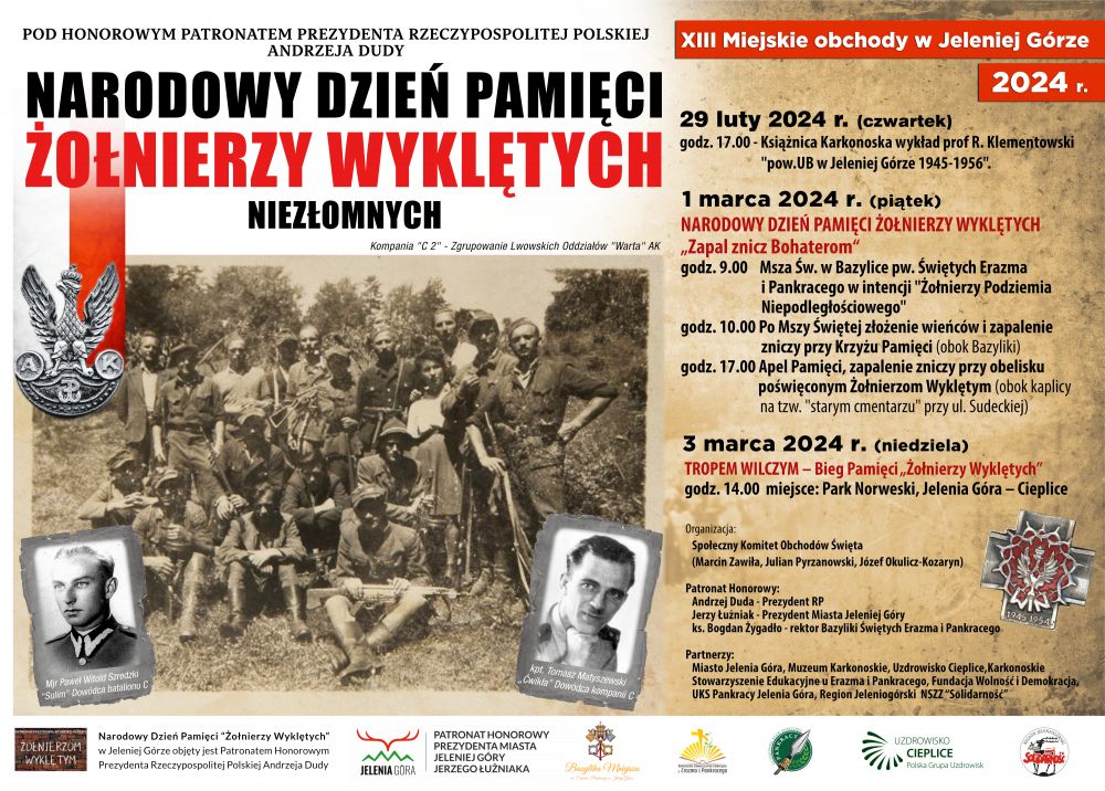 W ramach obchodów „Dnia Pamięci Żołnierzy Wyklętych w Jeleniej Górze”, w czwartek 29 II o godz. 17:00 w Książnicy Karkonoskiej odbędzie się wykład prof. R. Klementowskiego „UB w Jeleniej Górze 1945-1956”. Tego też dnia o godz. 19:00 w Auli Liceum Katolickiego odbędzie się „Wieczornica”, której gościem będzie Paweł Piekarczyk - bard, działacz społeczny z programem: „Podziemna armia powraca - historia żołnierzy niezłomnych”.
