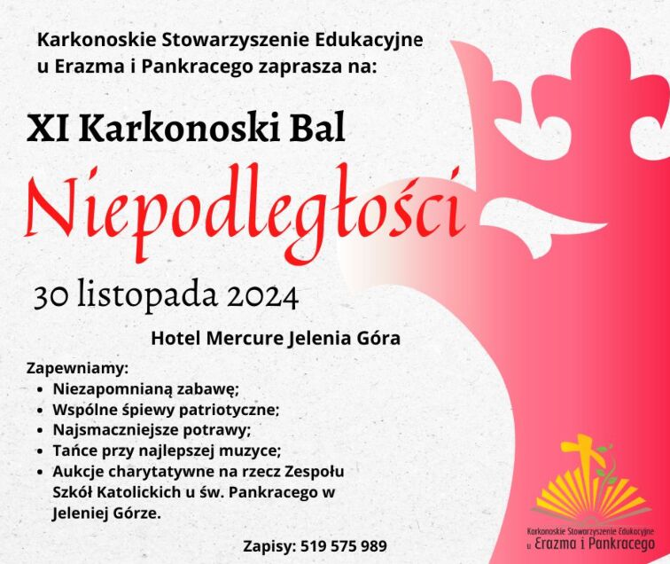 Serdecznie zapraszamy na XI Karkonoski Bal Niepodległości organizowany przez Karkonoskie Stowarzyszenie Edukacyjne u Erazma i Pankracego w Jeleniej Górze. Wydarzenie to odbędzie się 30 listopada 2024 roku w hotelu Mercure w Jeleniej Górze (ul. Sudecka 63).