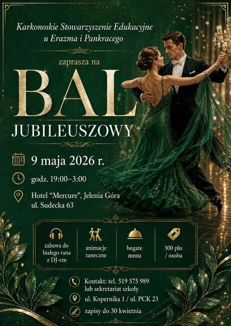Karkonoskie Stowarzyszenie Edukacyjne U Erazma i Pankracego z dumą i radością zaprasza na wyjątkowy Bal Jubileuszowy z okazji 15-lecia działalności.